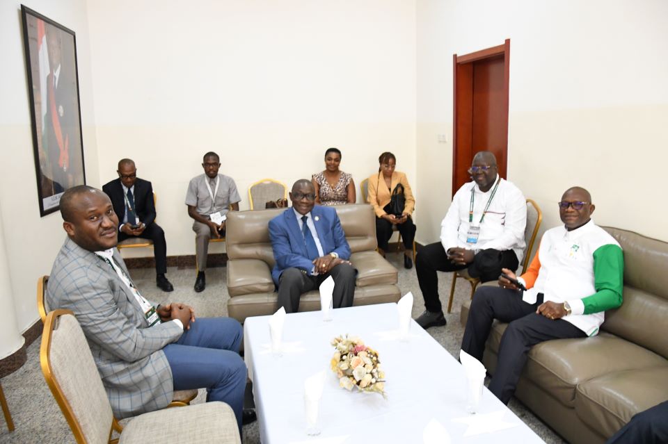 Le Premier Ministre, Ministre des Sports et du Cadre de Vie, a diligenté une délégation conduite par le Ministre de la Santé, de l'Hygiène Publique et de la Couverture Maladie Universelle, Pierre N'Gou DIMBA, comprenant le Ministre de la Communication Amadou COULIBALY, le Ministre Délégué en charge des Sports et du Cadre de Vie, Adjé Silas METCH, le Président du Comité d’Organisation de la Coupe d’Afrique des Nations (COCAN), Albert François AMICHIA, ce jeudi 08 février 2024 au Centre Media de la CAF basé au Palais de la Culture de Treichville.